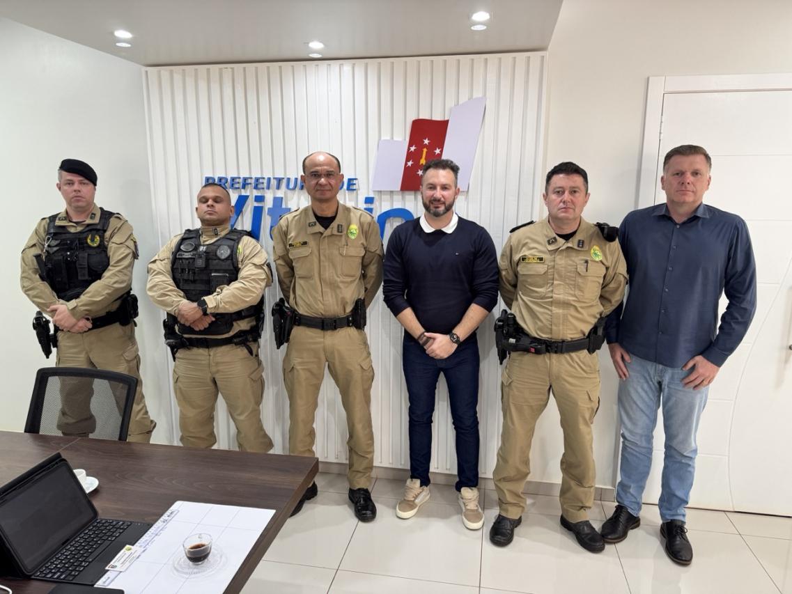 Na manhã desta quinta-feira (30), estiveram em reunião no Gabinete Municipal de Vitorino, o 7º Comando Regional de Polícia Militar (7º CRPM) de Pato Branco. Estiveram presentes o coronel Cícero José de Oliveira Tenório, o comandante do 3º BPM, major Anderson Marcelo Figueiredo, e o tenente Drummond. Na pauta da reunião, os projetos de colaboração entre município e Polícia Militar, para facilitar o trabalho dos agentes de segurança pública em Vitorino.