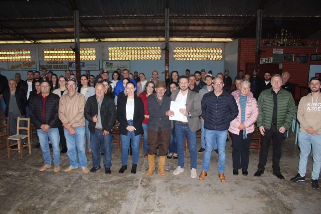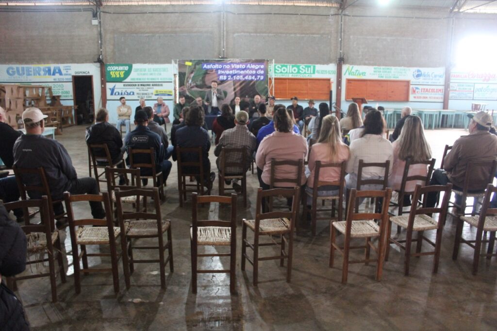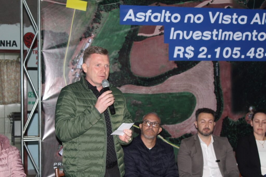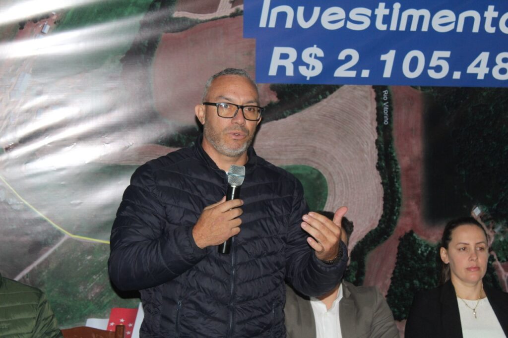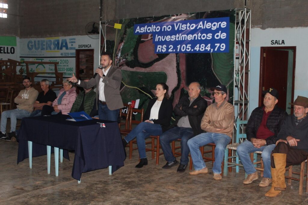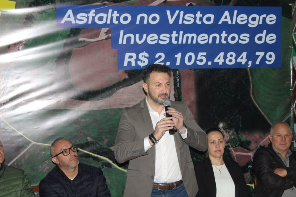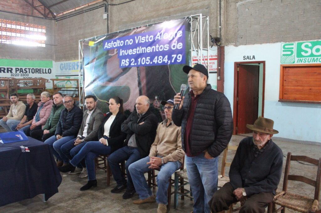 Na manhã desta quarta-feira (26), no Pavilhão da Comunidade Vista Alegre, foi autorizado a obra de pavimentação asfáltica, no trecho da Estrada Vicinal VT060, com investimentos de R$ 2.105.484,79 que possibilitará escoamento da produção agrícola local e a mobilidade da população rural, no trânsito facilitado entre cidade e campo. Para Valmor Badia, representante da Comunidade Vista Alegre “temos que agradecer ao prefeito Marciano, em nome da comunidade só temos que agradecer, e dizer que ficamos muito felizes de estar vindo mais um asfalto, futuramente fechando até a comunidade. Nós saímos daqui com caminhão carregado, com asfalto, tudo fica mais fácil”, afirmou.