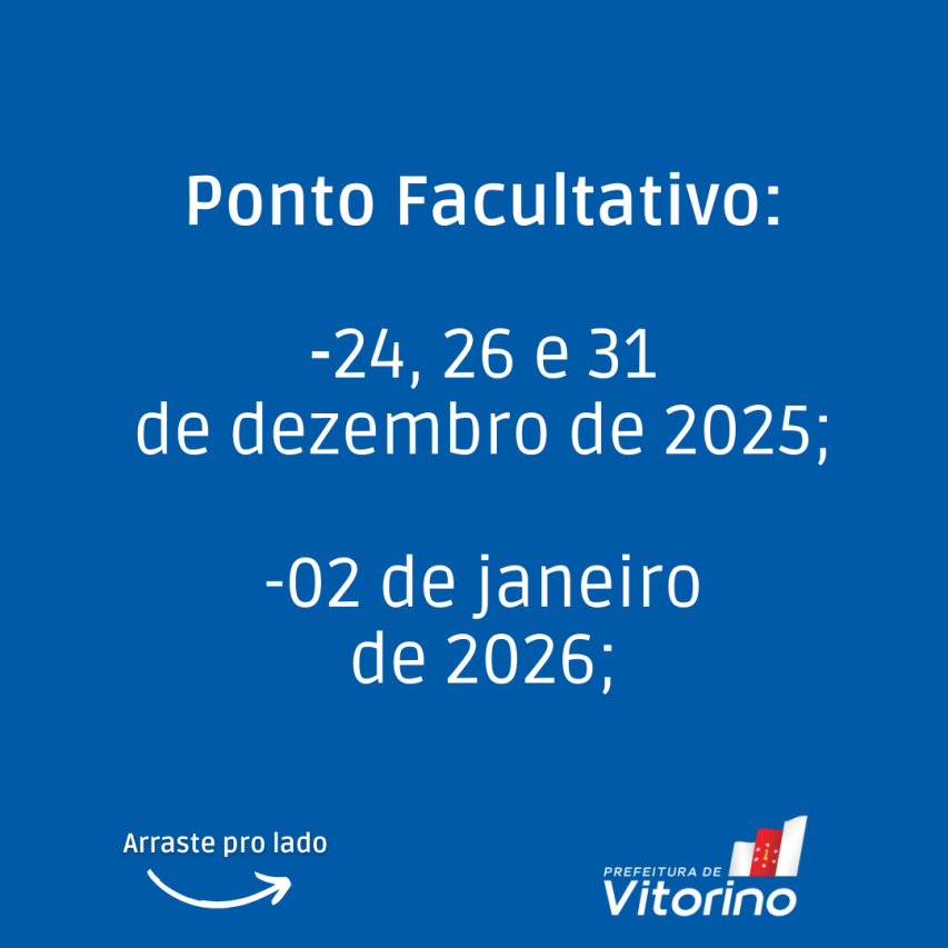 Haverá ponto facultativo nos dias 24, 26 e 31 de dezembro de 2025, e no dia 02 de janeiro de 2026, em todas as repartições públicas municipais;