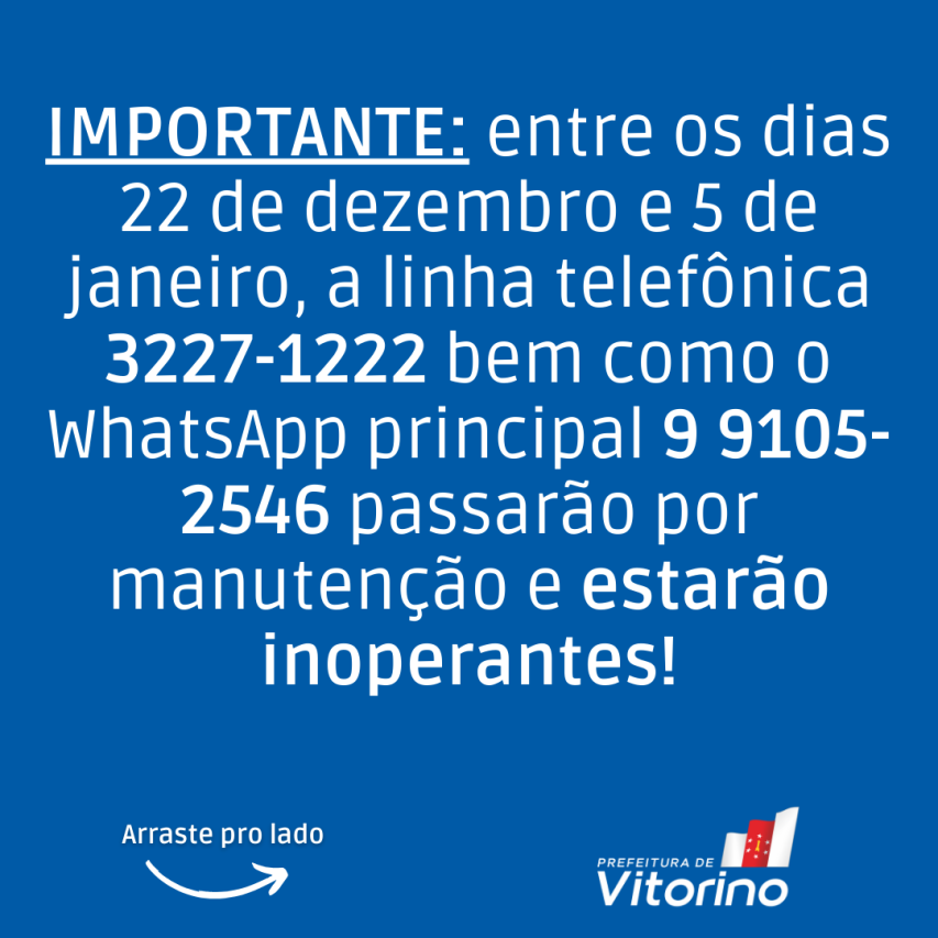 IMPORTANTE: entre os dias 22 de dezembro e 5 de janeiro, a linha telefônica 3227-1222 bem como o WhatsApp principal (9 9105-2546) passarão por manutenção e estarão inoperantes.