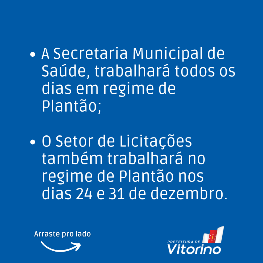 A Secretaria Municipal de Saúde, trabalhará todos os dias em regime de Plantão, juntamente ao Setor de Licitações que também trabalhará no regime de Plantão nos dias 24 e 31 de dezembro.