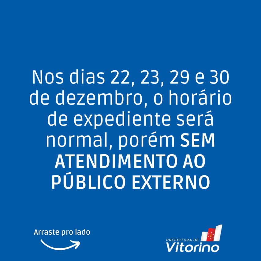 Nos dias 22, 23, 29 e 30 de dezembro, o horário de expediente será normal, porém SEM ATENDIMENTO AO PÚBLICO EXTERNO.