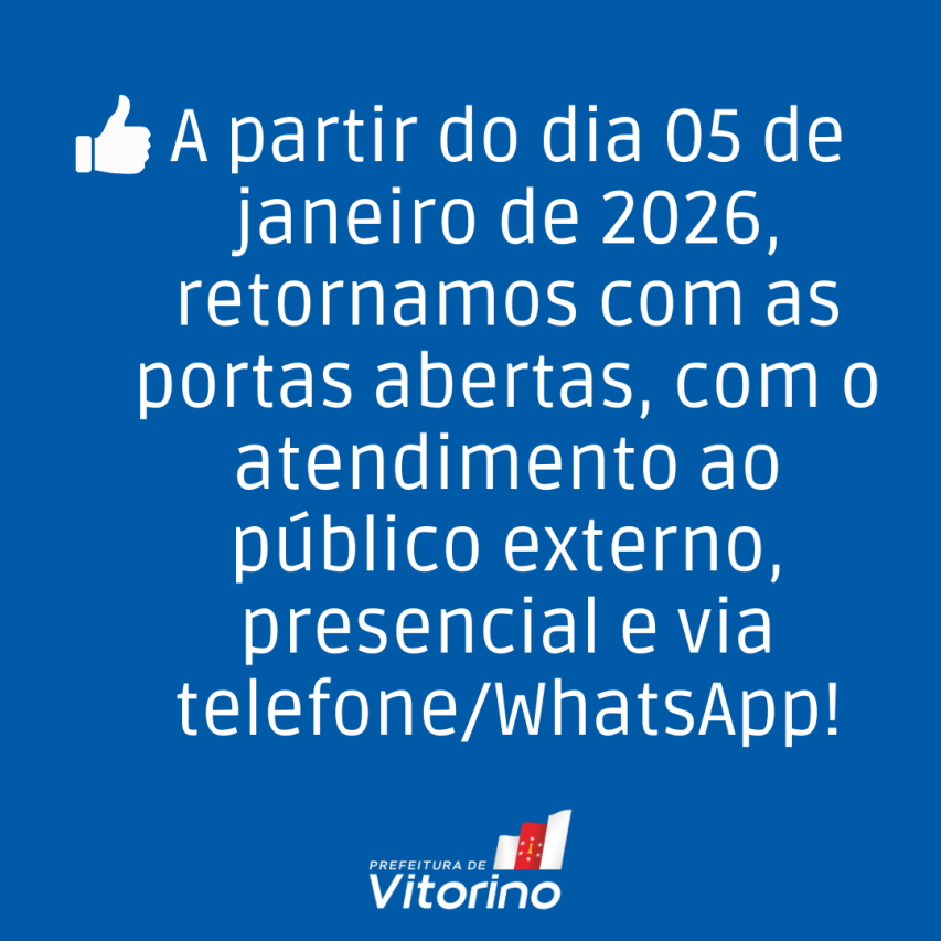 A partir do dia 05 de janeiro de 2026, o horário de expediente será normal, porém já com as portas novamente abertas, com o retorno do atendimento ao público externo, presencial e via telefone/WhatsApp!